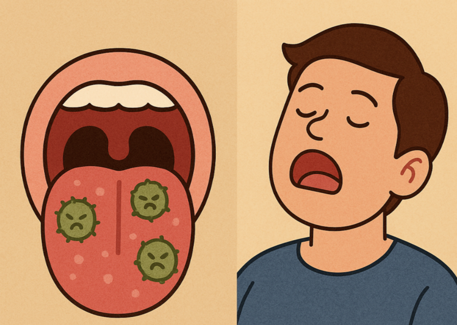 혀나 치아 사이, 잇몸 안쪽 등에는 수많은 세균이 서식하고 있습니다. 이 세균들은 단백질을 분해하면서 악취 물질을 생성하는데, 특히 밤사이에는 이 활동이 활발해져 입냄새가 심해집니다.